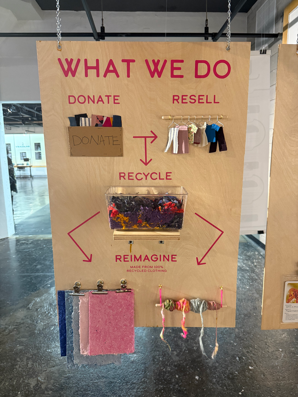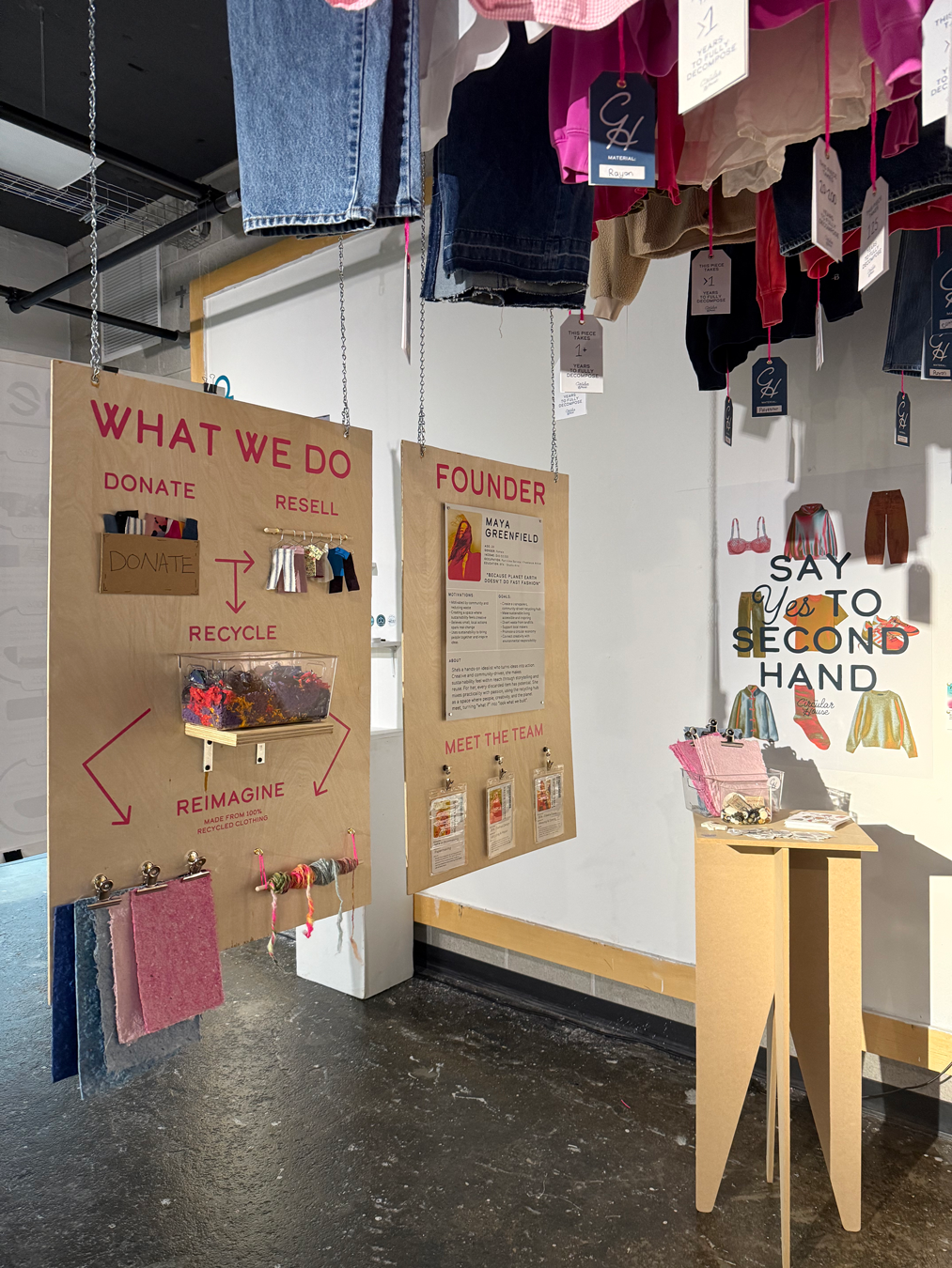 The Circular House functions as both a thrift store and a textile recycling center. Wearable garments are resold at low prices to support the local community, while unusable clothing is broken down into fibers and transformed into paper and yarn.