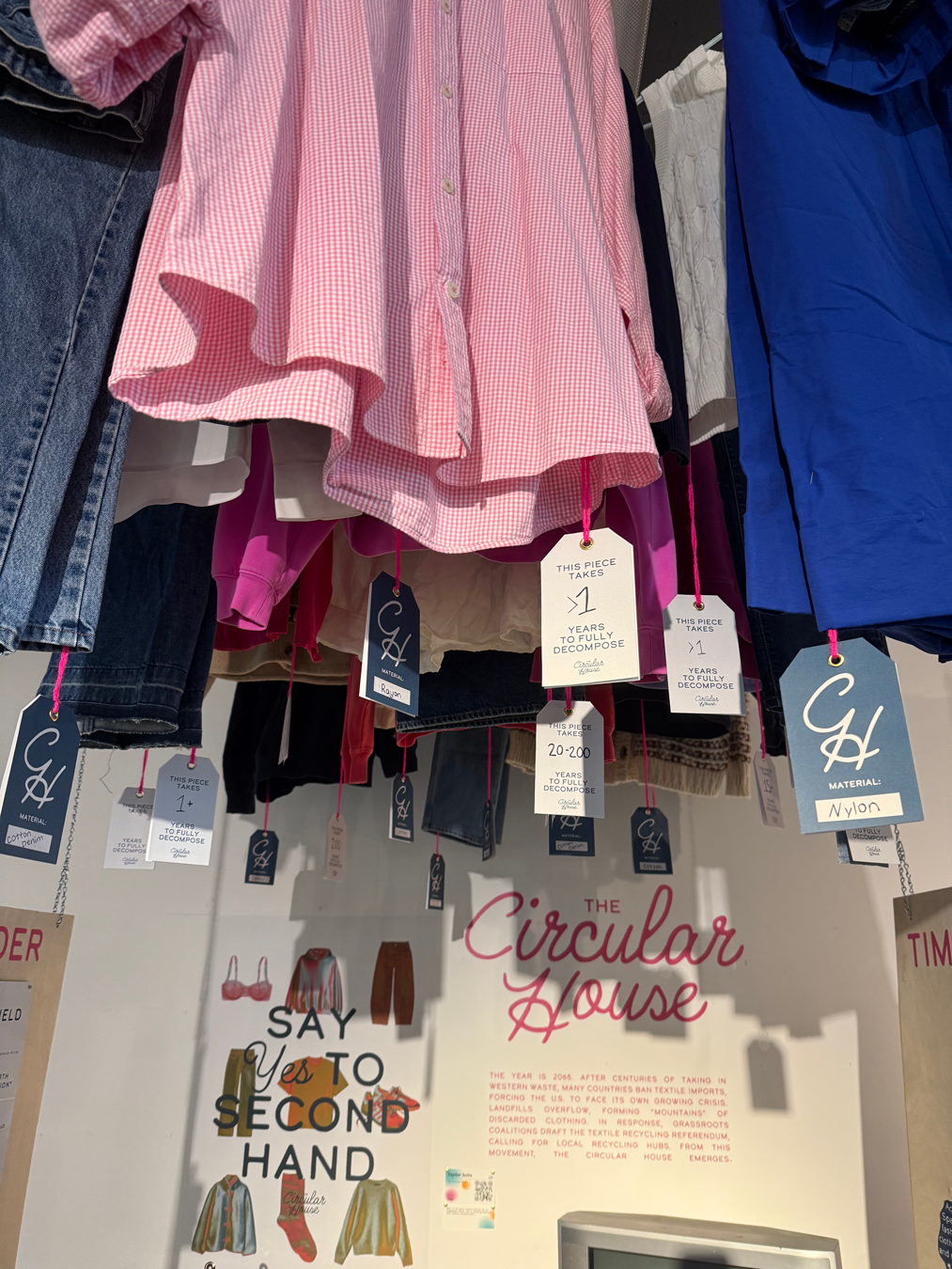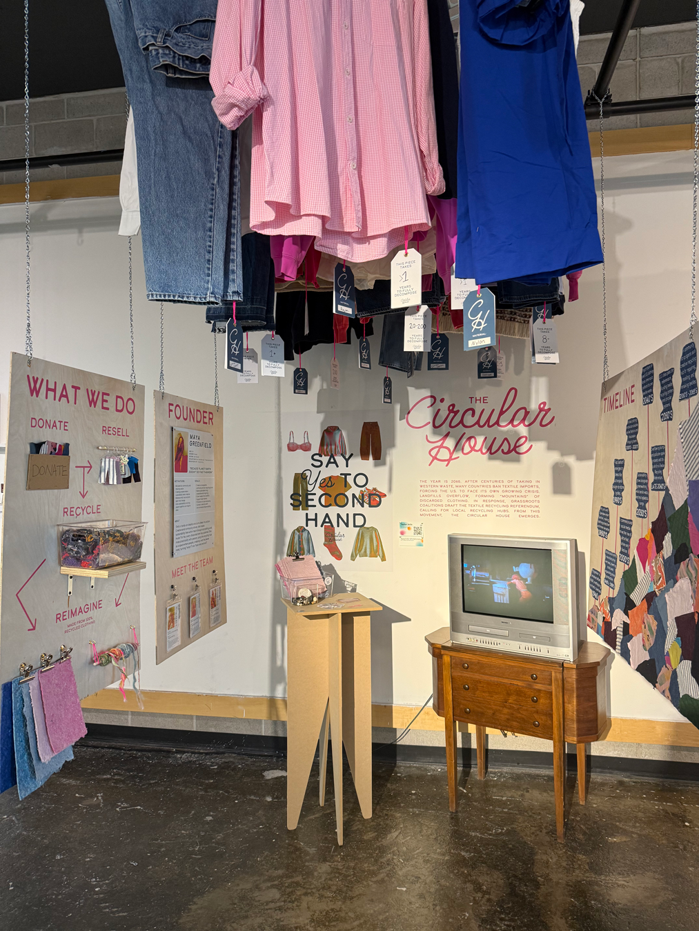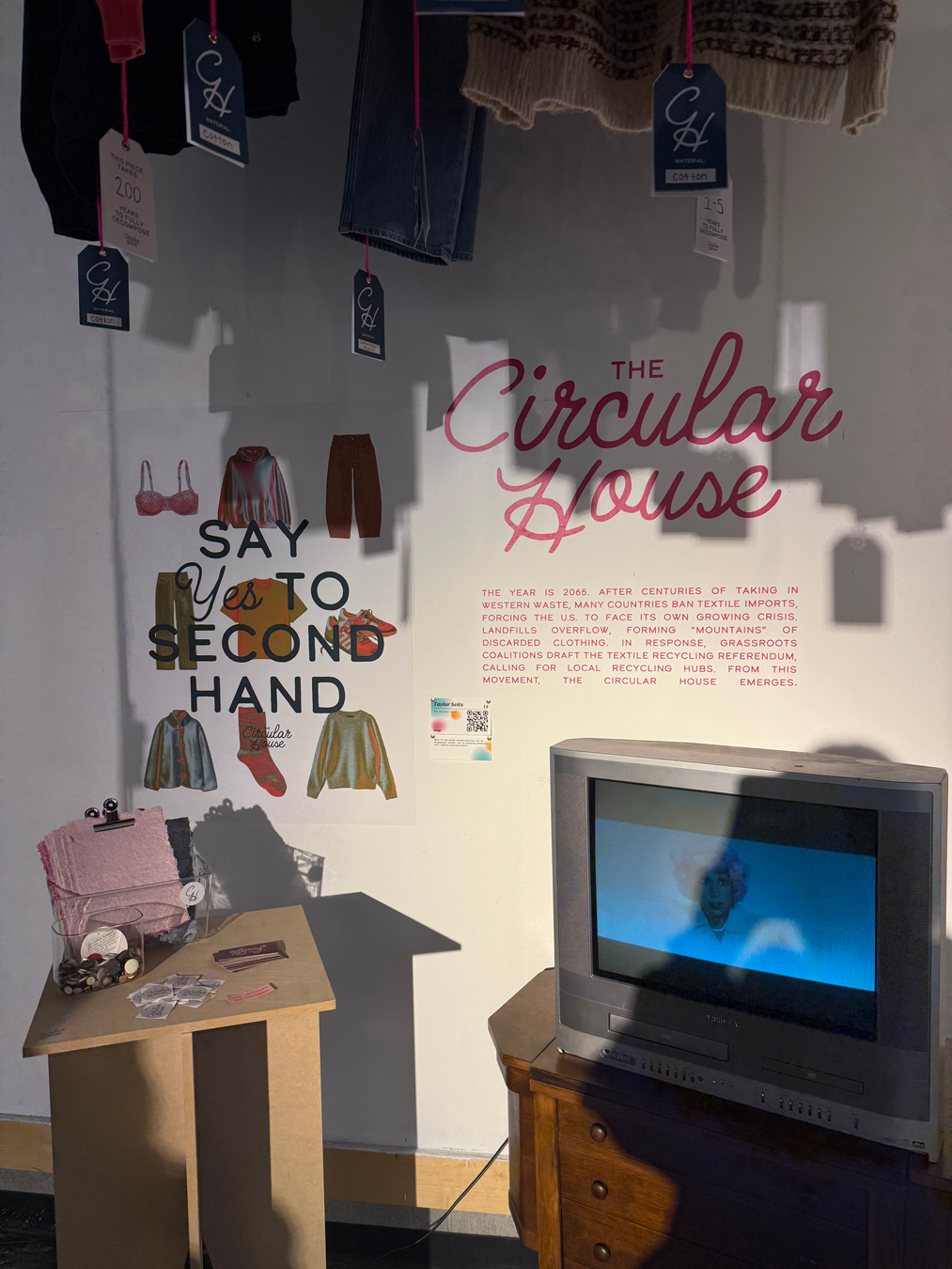 Set in the year 2065, The Circular House imagines a future shaped by landfill overflow after textile exports are banned. With the U.S. forced to confront its own waste, mountains of discarded clothing begin to scar the landscape. In response, grassroots coalitions establish the Textile Recycling Referendum, requiring every city to create a hub for reselling and recycling textiles.