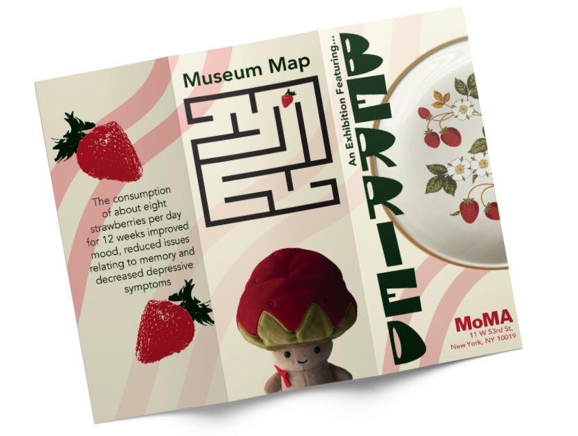 To bring the identity to life, I developed a custom typeface for the wordmark with bold, thick forms that express the character of strawberries without relying solely on imagery. The color palette pulls directly from strawberries—reds, pinks, greens, and a soft cream—to create a warm, inviting aesthetic across formats.