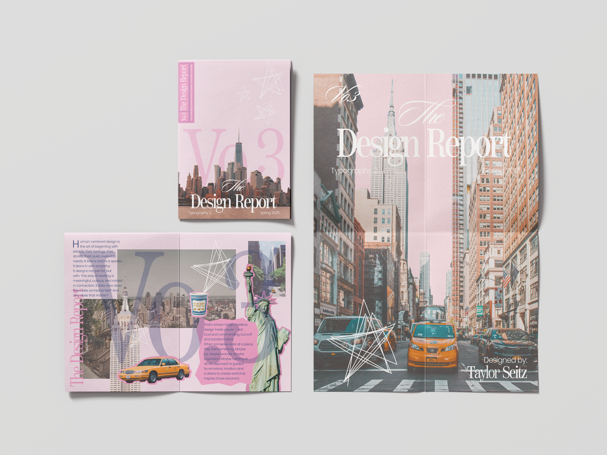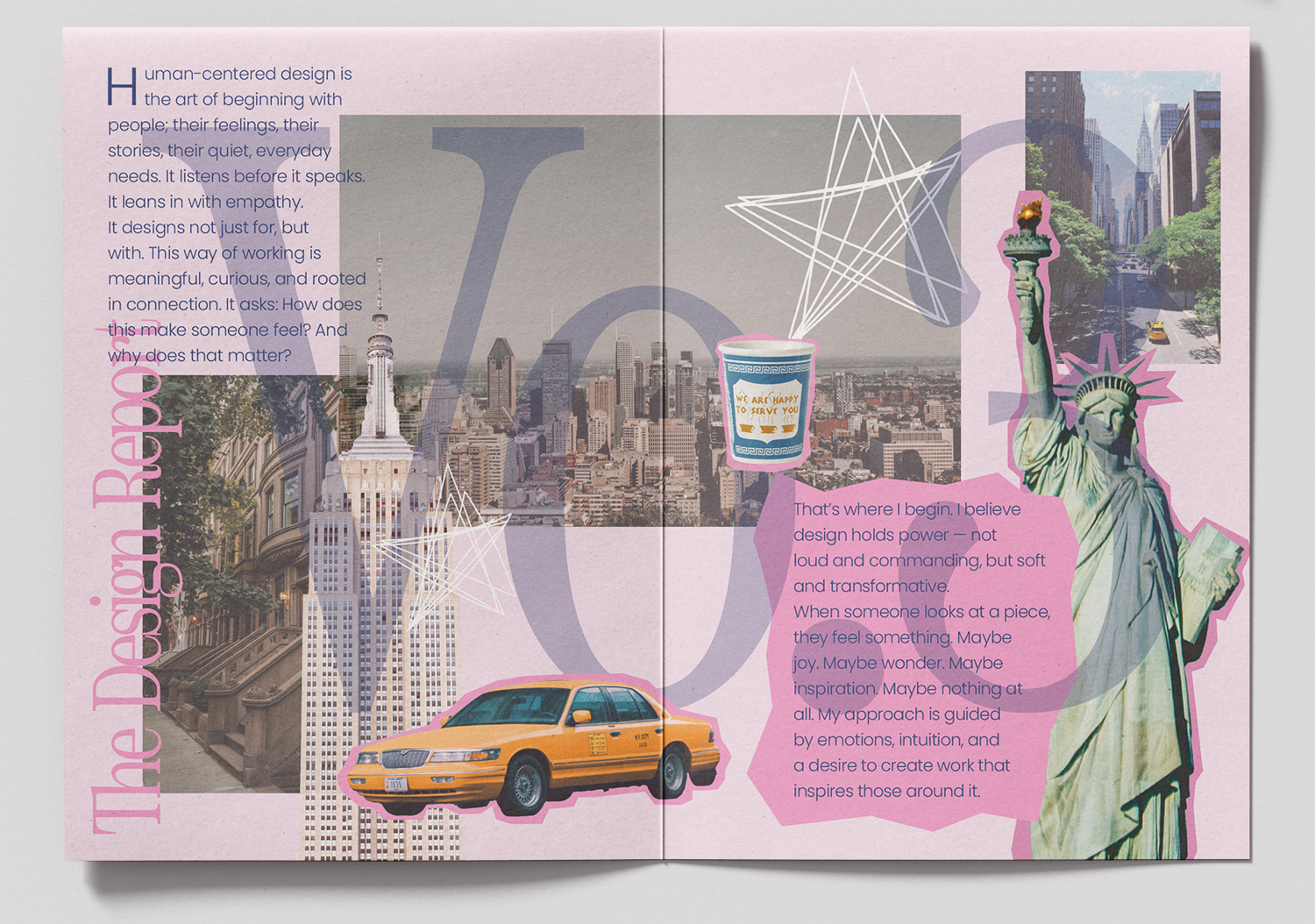Influenced by editorial and magazine design, the piece uses publication-inspired typography to reflect my connection to print culture. Layered imagery, text, and graphic elements add depth to the two-dimensional format, referencing the energy and structure of magazine spreads. New York City imagery represents creativity, individuality, and fast-paced momentum—qualities that align with both my personal and professional design approach. A palette of pinks and deep blue-purples balances softness and boldness, while a structured grid system ensures clarity, hierarchy, and cohesion within the collage-style layout. Together, these choices form an engaging piece that captures my evolving visual voice as a designer.
