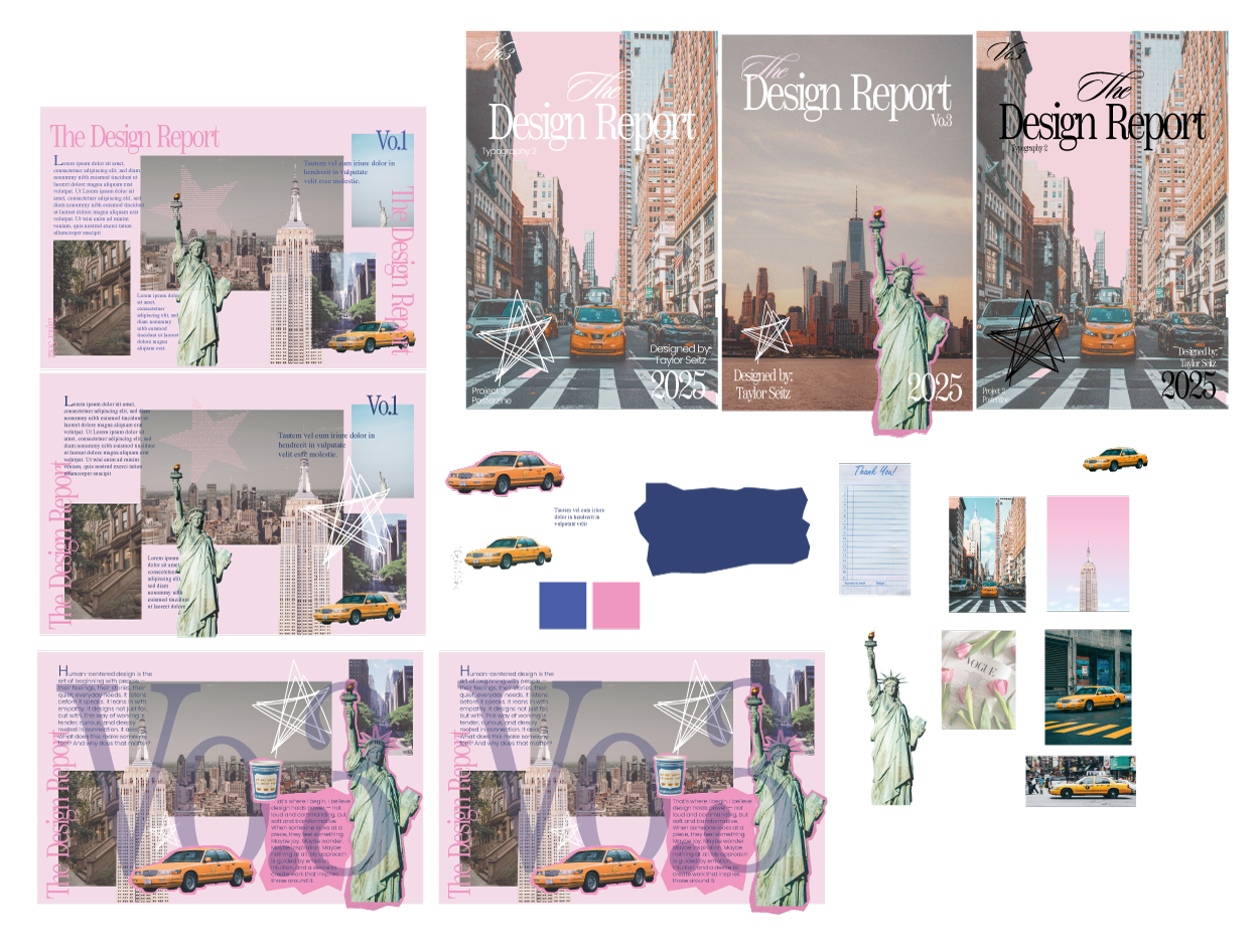 This project developed through an exploratory process rooted in mood boarding, editorial research, and visual experimentation. I drew inspiration from magazine layouts, expressive typography, and layered collage elements, allowing recurring motifs to guide the direction of the design. New York City imagery became a central anchor, representing movement and creative energy, while structured grids and thoughtful color choices brought balance to the final piece.